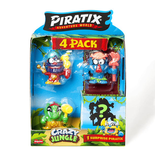 O Piratix - Crazy Jungle 4 Pack da Magicbox foi desenhado para jovens exploradores que querem mergulhar no mundo de Piratix e descobrir os seus segredos mais escondidos. Conteúdo do pack: 3 Piratix: 2 regulares e 1 especial em neón. Existem 6 modelos diferentes em 2 cores. 1 Piratix surpresa: Uma figura misteriosa que adiciona emoção e surpresa à tua coleção. 4 acessórios: Complementos que melhoram a experiência de jogo e permitem personalizar os teus Piratix.